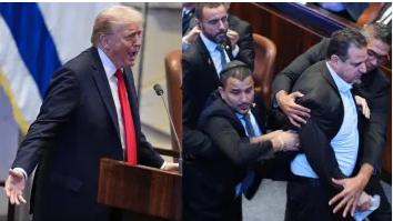 इजरायली संसदमा ट्रम्पले सम्बोधन गर्दा विपक्षी सांसदले देखाए प्लेकार्ड