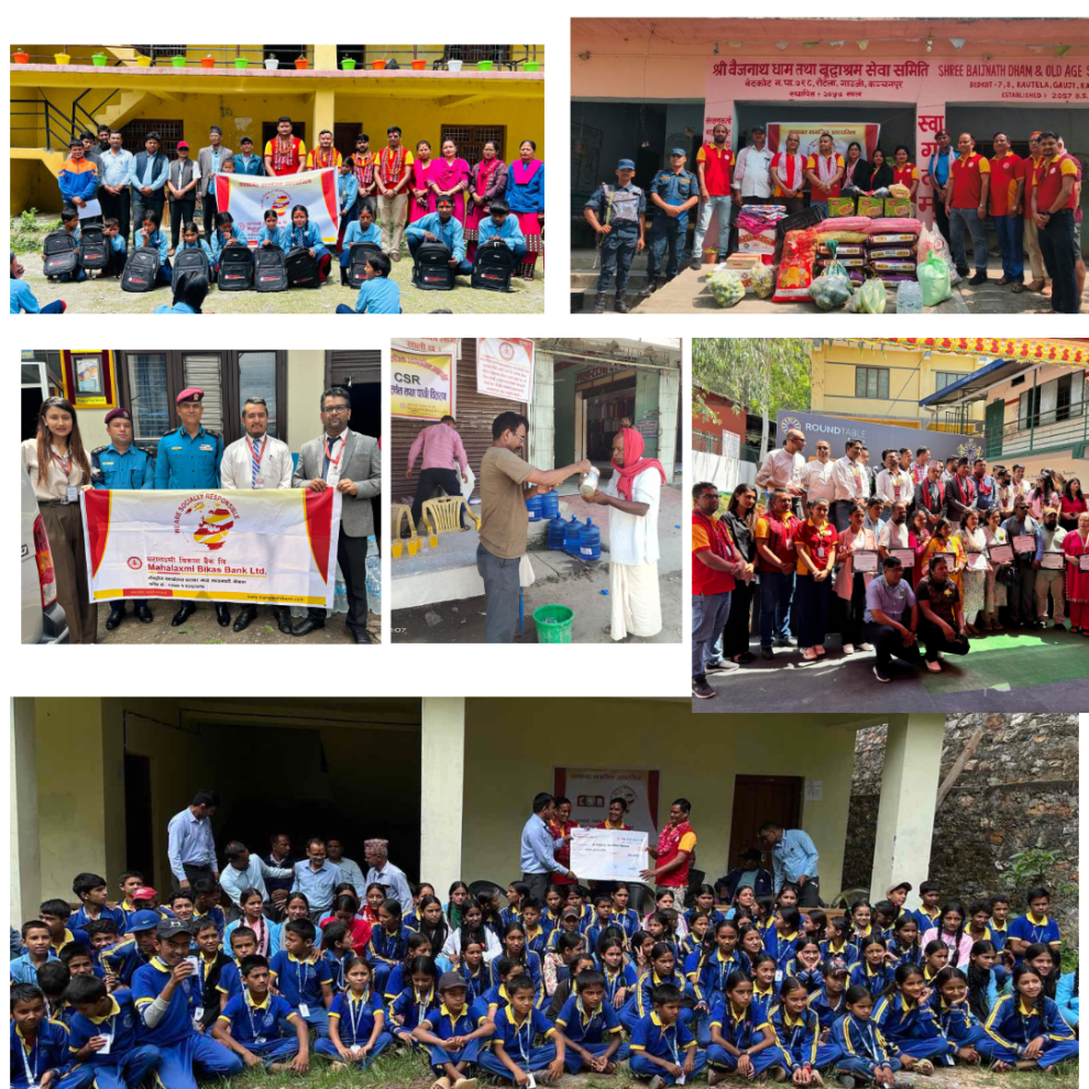 त्यसैगरी बैंकको महेन्द्रनगर शाखाले कञ्चनपुर स्थित श्री बैजनाथ धाम तथा बृद्धाश्रम सेवा समितिलाई खाद्मान्न सामाग्री प्रदान गरेको छ । साथै काठमाण्डौं जिल्ला बुढानिलकण्ठ न.पा. वडा नं.४ क्वाँटोल, चण्डेश्वरी स्थित श्री मदन आश्रित आदर्श माध्यामिक विद्यालयमा अध्ययनरत ११ जना विद्यार्थीहरुका लागि राउण्ड टेबल नेपालको सहकार्यमा शैक्षिक सत्र २०८२ को लागि छात्रवृति वितरण कार्यक्रम सम्पन्न गरेको छ ।