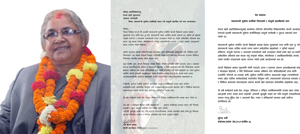 काठमाडौं । जेनजी आन्दोलनबाट अन्तरिम सरकारको प्रधानमन्त्री बन्न सफल पूर्व प्रधानन्यायाधिश सुशिला कार्कीलाई गिरफ्तार गरी छानविनको माग गर्दै जेनजीहरुले नेपाल प्रहरीका प्रमुखलाई निवेदन दिएका छन् । शुक्रबार प्रेस विज्ञप्ति मार्फत जारी गर्दै एनटेक जेडका संयोजक सुरेन्द्र घर्तीले प्रधानमन्त्री सुशिला कार्कीले जेन्जी विद्रोहको क्रममा देशका युवाहरुको रगतमाथि सत्ता कु गरेर प्रधानमन्त्री पदमा बसेको र सो कदम संविधान, कानूनी परम्परा र जनताको म्याडेटको ठाडो उल्लंघन भएको आरोप लगाएका छन् ।