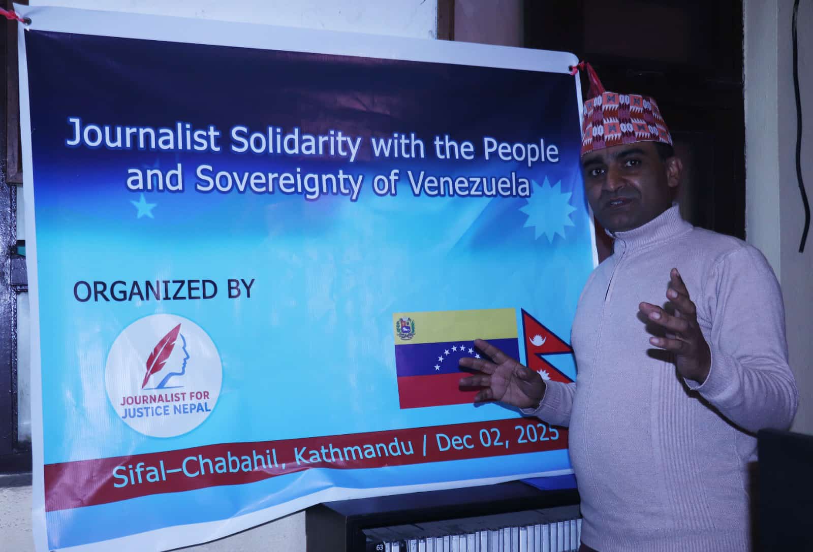 काठमाडौं । न्यायका लागि पत्रकार (जर्नलिस्ट फर जस्टिस) नेपालले भेनेजुएलाका जनताको पक्षमा “जर्नलिस्ट सोलिडारिटी विथ द पीपल एन्ड सोअभरेन्टी अफ भेनेजुएला“ कार्यक्रम सम्पन्न गरेको छ । अमेरिकाले भेनेजुएलासँगको द्वन्द्वलाई आक्रामक ढंगले बढाएको र समाधानका लागि संवादको मार्ग अपनाउन जर्नलिस्ट फर जस्टिस नेपालले आह्वान समेत गरेको छ । न्याय, सार्वभौमिकता, र भेनेजुएलाका जनताको अधिकारको सम्मान गर्न आग्रह गर्दै, शक्तिको प्रयोग एकजुट र रचनात्मक तरिकामा गर्नुपर्ने भन्दै न्यायका लागि कलम चलाउँदै आईरहेका पत्रकारहरूको समूहले यस समस्याको समाधान शान्तिपूर्ण संवाद र छलफलमार्फत खोज्न माग समेत गरेका थिए ।
