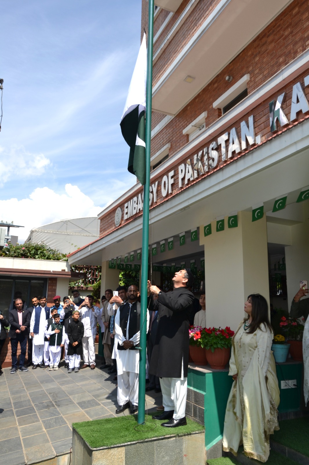 Kathmandu: A flag hoisting ceremony was held at the Embassy of Pakistan in Kathmandu to mark the 86th National Day of Pakistan. The national flag was hoisted by Ambassador Abrar H. Hashmi at the chancery building, followed by the reading of messages from Pakistan’s leadership.